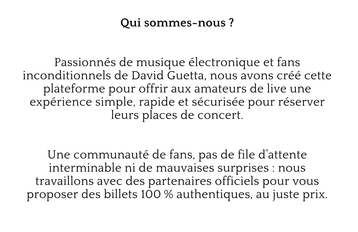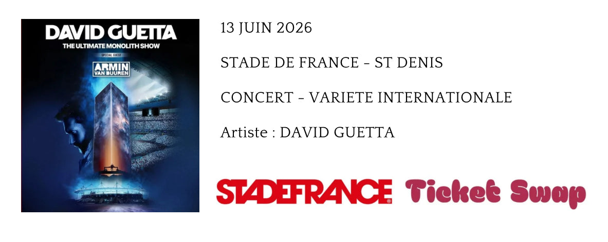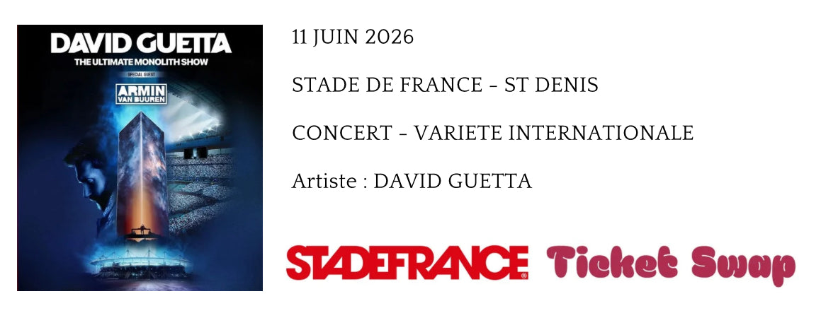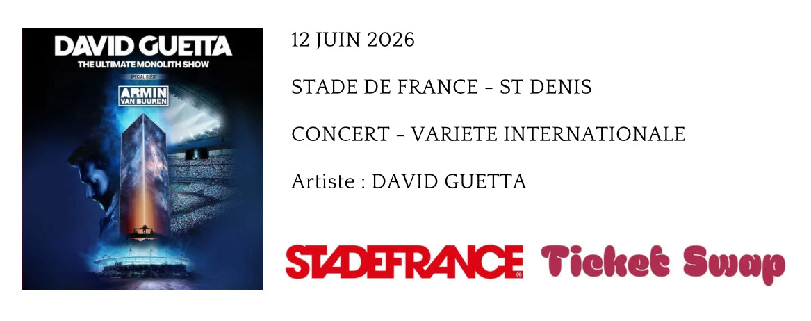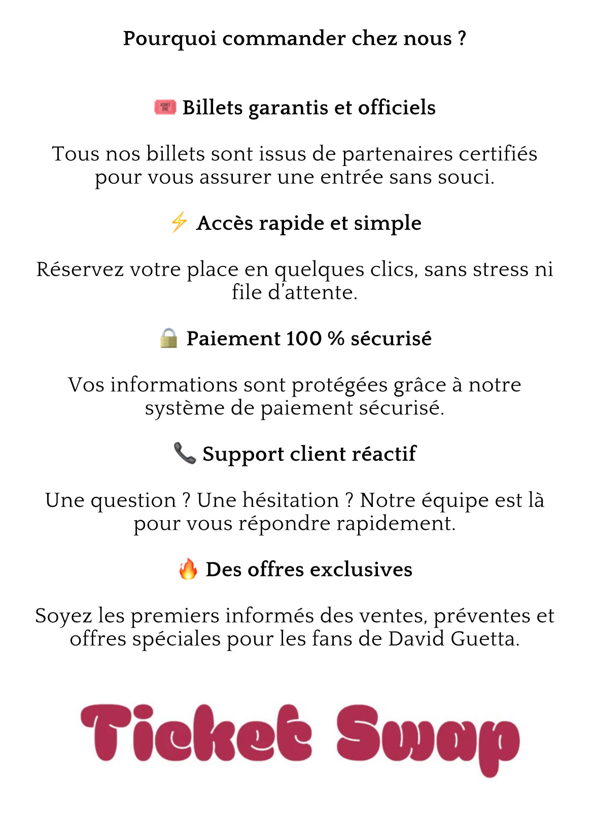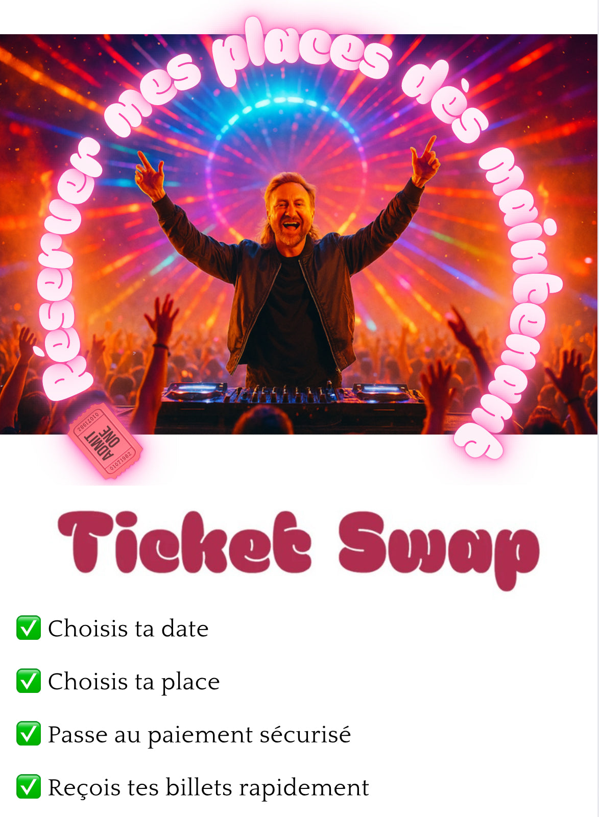 Ticket Swap est une plateforme sécurisée qui permet d’acheter ou revendre des billets pour les concerts de David Guetta, en toute confiance.